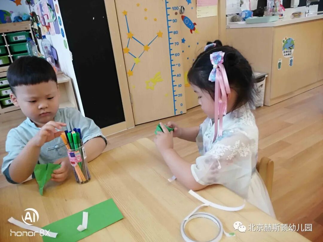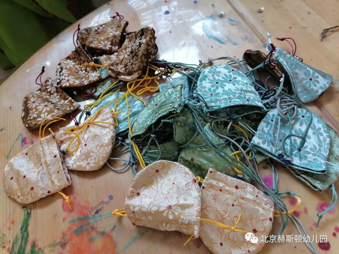 孩子们挑选了5根自己喜欢颜色的彩绳和艾叶等材料,一起编织了五彩绳和荷包,相互佩戴。带上了五彩绳,愿小朋友们一年都可以平平安安,健康成长。